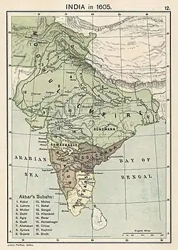 India in 1605 and the end of emperor Akbar's reign; the map shows the different subahs, or provinces, of his administration