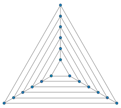 The nested triangles graph was named by Dolev, Leighton & Trickey (1984), who used it to show that drawing an n-vertex planar graph in the integer lattice (with straight line-segment edges) may require a bounding box of size at least n/3 × n/3.[1] In such a drawing, no matter which face of the graph is chosen to be the outer face, some subsequence of at least n/6 of the triangles must be drawn nested within each other, and within this part of the drawing each triangle must use two rows and two columns more than the next inner triangle. If the outer face is not allowed to be chosen as part of the drawing algorithm, but is specified as part of the input, the same argument shows that a bounding box of size 2n/3 × 2n/3 is necessary, and a drawing with these dimensions exists.