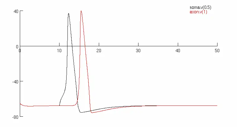 A plot can be generated showing the voltage traces starting from the soma and the distal end of the axon. The action potential at the end of the axon arrives slightly later than it appears in the soma at the point of stimulation. The plot is membrane voltage versus time.