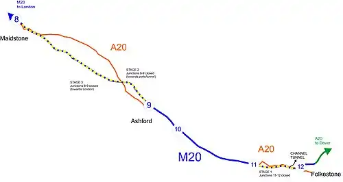 - ^ "Phase 4 is the closure of the coastbound M20 between J8 & J12, in addition to the current London bound closure of M20 J9 – J8". Kent County Council. Retrieved 7 January 2015.