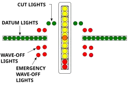 - Wave-off lights – red flashing lamps which, when lit, indicate that the pilot must add full power and go around – a mandatory command. When the wave-off lights are lit, all other lamps are extinguished. The wave-off lights are operated manually by the LSO.