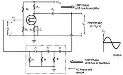 A phase-shift oscillator is a linear electronic oscillator circuit that produces a sine wave output. It consists of an inverting amplifier element such as a transistor or op amp with its output fed back to its input through a phase-shift network consisting of resistors and capacitors in a ladder network. The feedback network 'shifts' the phase of the amplifier output by 180 degrees at the oscillation frequency to give positive feedback.[1] Phase-shift oscillators are often used at audio frequency as audio oscillators.