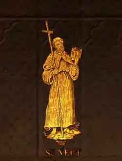 Neot was small of stature: four feet tall. An important visitor arrived at Glastonbury church, of which Neot was sacrist, responsible for the general management of the building. The visitor knocked loudly, but he had arrived at a time when the occupants, including Neot, were taking a midday nap. Neot was eventually woken by the visitor's knocking, and went to open the door to him. It was approached from within by a step upwards, so that the lock was very high from the place where Neot could stand, and he could not reach it.[41]