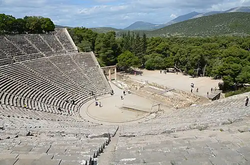 Participation in the city-state's many festivals—and mandatory attendance at the City Dionysia as an audience member (or even as a participant in the theatrical productions) in particular—was an important part of citizenship.[14] Civic participation also involved the evaluation of the rhetoric of orators evidenced in performances in the law-court or political assembly, both of which were understood as analogous to the theatre and increasingly came to absorb its dramatic vocabulary.[15][16] The Greeks also developed the concepts of dramatic criticism and theatre architecture.[17][18][19] Actors were either amateur or at best semi-professional.[20] The theatre of ancient Greece consisted of three types of drama: tragedy, comedy, and the satyr play.[21]