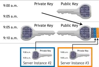An individual transient key interval chain can be cross-certified with other transient key chains and server instances. Through cross-certification, Server A signs Server B's interval chain, the signed data of which is the interval definition. In effect, the private keys from Server B are used to sign the public keys of Server A. In the diagram, a server instance is cross-certified with two other server instances (blue and orange). Cross-certification requires that the timestamp for the interval agree with the timestamp of the cross-certifying server within acceptable tolerances, which are user-defined and typically a few hundred milliseconds in duration.